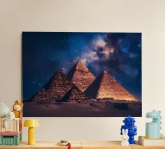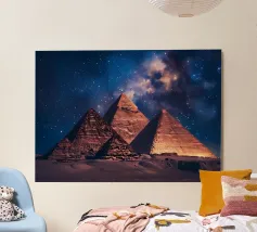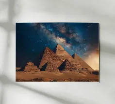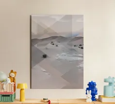 Un terreno da sogno cucito dal tempo e dal mito: All At Once fonde tre paesaggi iconici in un mondo surreale e senza luogo. Il tranquillo specchio del Monte Fuji di Kashiwabara (1896, Kazumasa Ogawa) si innalza nella silhouette delle Piramidi di El-Geezeh di Frith del 1858, il tutto coronato dalle eteree dune di White Sands, nel Nuovo Messico, catturate dalla NASA. Insieme, queste scene dissolvono la geografia e la cronologia per evocare una tranquilla meraviglia cinematografica, dove vulcani e faraoni si incontrano davanti a dune simili a nuvole. Un portale per il muro e un pellegrinaggio per l'occhio.