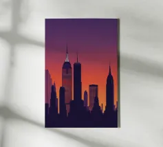 Una rappresentazione audace e raffinata della città di New York, questa opera d'arte mette in mostra l'Empire State Building e i grattacieli circostanti in una suggestiva silhouette minimalista. Il cielo arancione fa da sfondo drammatico e si fonde perfettamente con lo skyline nero per creare un capolavoro visivo.