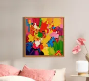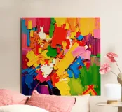 Colori vivaci si fondono in forme dinamiche, creando una composizione gioiosa ed energica. L'assortimento di tonalità offre un'esperienza visiva sorprendente e piena di movimento.