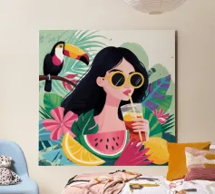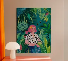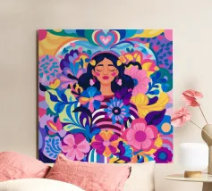Questo dipinto raffigura una persona con i capelli neri che indossa un abito colorato con forme geometriche. Lo sfondo è rosso e la persona è adornata con grandi orecchini circolari.