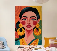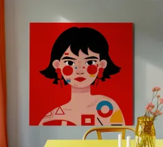 Questo dipinto raffigura una persona con i capelli scuri acconciati in due chignon, che indossa grandi orecchini arancioni. Il volto della persona è dipinto con audaci motivi rossi e bianchi, mentre lo sfondo è di colore rosso pieno.