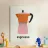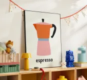 Un'affascinante illustrazione della cultura italiana del caffè: questa giocosa rappresentazione di una classica caffettiera per espresso affascina con la sua allegra combinazione di colori in arancione, rosa e azzurro. Lo stile pittorico naif con texture e macchioline visibili ricorda l'illustrazione scandinava e la grafica vintage di metà secolo. La forma ridotta e i contorni netti conferiscono all'oggetto quotidiano uno status iconico. La parola "espresso" sotto di essa funziona come una firma tipografica. Quest'opera allegra celebra la semplice bellezza del rito del caffè mattutino, perfetta per cucine e bar.