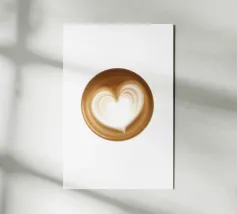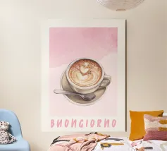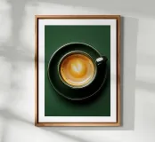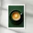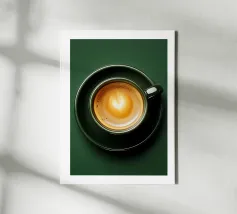 Vista dall'alto di un espresso cremoso in una tazza e un piattino verde intenso, con un cuore di latte art che galleggia sulla ricca crema. Lo sfondo tono su tono e la composizione minimalista mettono in risalto la ceramica lucida e le calde tonalità del caffè, creando un accento di design pulito per una cucina, un angolo caffè, un bar o un ufficio. Moderna, elegante e rassicurante, questa decorazione murale aggiunge calore, raffinatezza e attenzione a qualsiasi spazio.