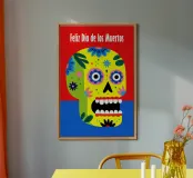 Celebrazione colorata dell'arte popolare: questa allegra composizione celebra il Día de los Muertos messicano con vibrante intensità. I colori primari - giallo radioso, rosso brillante, blu intenso - e i motivi floreali naif ricordano l'arte popolare messicana tradizionale. Il teschio, con il suo ampio sorriso e gli ornamenti floreali, incarna l'amorevole tradizione messicana di celebrare la morte, e quindi anche la vita. Un omaggio commovente alla cultura messicana, perfetto per chi vuole unire gioia di vivere e tradizione, e non solo in questo giorno.
