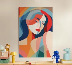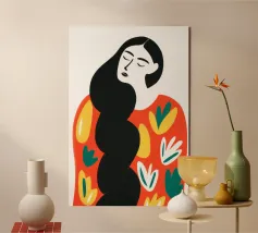 Questa elegante illustrazione mostra una donna misteriosa con occhi chiusi e labbra rosse su uno sfondo rosso brillante. Lo stile minimalista ricorda i dorati anni Venti e i ritratti glamour di Tamara de Lempicka. La palette di colori ridotta di nero, bianco e rosso esalta l'effetto drammatico, mentre le forme geometriche respirano pura estetica Art Déco. Un pezzo senza tempo dal fascino vintage, perfetto per gli amanti dell'eleganza classica e del minimalismo moderno. Aggiunge classe e mistero a qualsiasi ambiente.