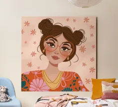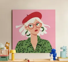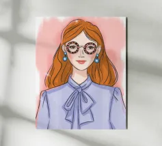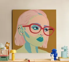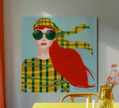 Questo vivace ritratto pop art presenta una rossa sicura di sé che indossa audaci occhiali verdi da gatta e un dolcevita giallo. Il mix di elementi retrò e moderni crea una divertente dichiarazione di intelligenza, stile e impavida individualità.