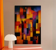 Una composizione astratta ricca e contemporanea, costruita con forme geometriche stratificate e colori profondi e suggestivi. Curve e blocchi si intersecano in una disposizione accuratamente bilanciata, creando un senso di ritmo architettonico e profondità visiva. La texture della superficie aggiunge un sottile calore pittorico, ammorbidendo la geometria e conferendo all'opera una presenza tattile e artigianale.