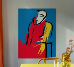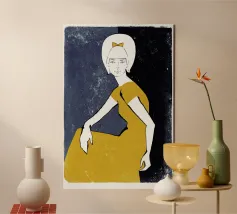 Una rappresentazione astratta e pittorica di una figura sdraiata in audaci ed espressivi tratti di giallo su uno sfondo blu scuro, che celebra la forma umana con grazia minimalista e colori vibranti.