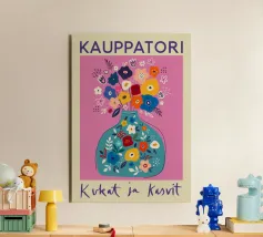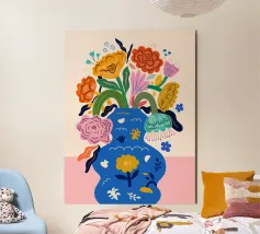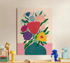 Questo allegro motivo floreale mostra un vaso blu stilizzato pieno di fiori colorati in arancione, rosso, giallo e rosa, incorniciato da una calda tonalità corallo. Il disegno irradia gioia di vivere e armonia ed è perfetto per murales, cuscini, tazze, cover per cellulari e altro ancora. Ideale per chi ama un'estetica fresca e moderna e desidera ravvivare la propria casa con accenti colorati e naturali. Questa composizione floreale senza tempo si adatta a qualsiasi ambiente e a qualsiasi stile di casa.