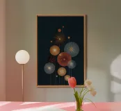 Un'impressionante esibizione di fuochi d'artificio astratti resi in una pulita geometria Bauhaus. Linee radianti e audaci esplosioni circolari illuminano la tela scura con un contrasto festoso e un tocco minimalista. Una celebrazione del movimento, del ritmo e della magia delle feste, perfetta per gli interni moderni alla ricerca di un tocco stagionale unico.