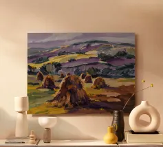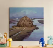 Un dipinto di paesaggio con un grande pagliaio in un campo vicino a un fiume o a uno specchio d'acqua tranquillo. Il cielo è di un grigio tenue e coperto, e la tavolozza generale è sobria con toni terrosi.