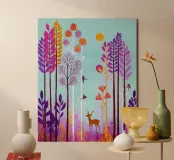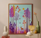 Foresta incantata colorata con cervi e uccelli alluminio dibond