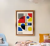 Un poster astratto in stile Bauhaus estremamente dinamico, caratterizzato da una composizione densa ed equilibrata di colori primari e forme geometriche pure. L'opera d'arte combina cerchi e quadranti rossi, blu e gialli con linee nere decise e motivi complessi, tra cui una serie impressionante di triangoli neri e un cerchio giallo punteggiato. Questo pezzo incarna perfettamente la natura sperimentale e strutturata dei movimenti costruttivisti e Bauhaus. Il poster digitale vanta una risoluzione superiore di 7000x5000 pixel a 300 dpi, garantendo dettagli e fedeltà cromatica eccezionali per un interno moderno e vibrante.