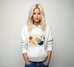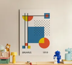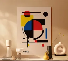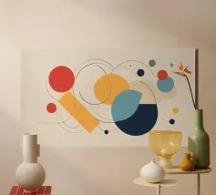 L'opera d'arte presenta una disposizione dinamica di forme geometriche dai colori vivaci. Cerchi, rettangoli e linee si intrecciano, creando un senso di movimento ed equilibrio.