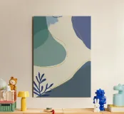 Un'opera d'arte astratta e rilassante che presenta una composizione di forme organiche e fluide in una tavolozza tenue di blu, verde e beige, accentuata da un'unica linea dorata. L'opera è serena, minimalista e sofisticata.