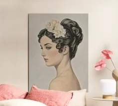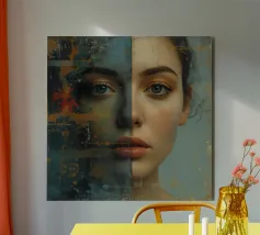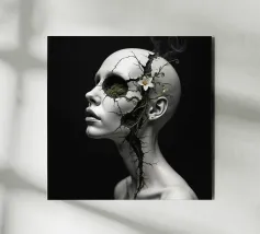 Un'opera d'arte moderna ed espressiva che mostra una figura femminile di profilo, metà umana e metà pietra. Le sottili transizioni tra pelle e struttura simboleggiano profondità emotiva, fragilità e forza allo stesso tempo. La combinazione di colori neutri, beige e grigi, conferisce all'immagine calma ed eleganza, perfetta per ambienti moderni, minimalisti e profondi.