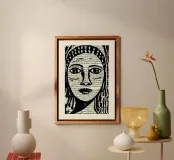 Ritratto di donna in linoleografia, stampato a mano su carta antica del 1850. Ispirata all'estetica della calligrafia d'epoca, questa creazione fonde tradizione e modernità, abbracciando delicatamente i tratti femminili. Un'opera d'arte singolare, che unisce l'eredità del passato a un look contemporaneo, ideale per un ambiente unico e artistico.