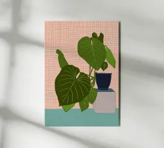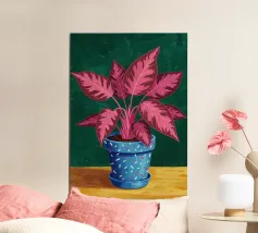Una pianta di anthurium rosa di grande effetto si trova in un vaso variopinto e decorato su uno sfondo di un vibrante rosa caldo. La composizione è una celebrazione audace ed elegante del colore e delle piante tropicali.