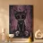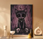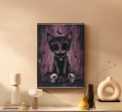 Questa affascinante illustrazione mostra un misterioso gatto nero con grandi occhi luminosi seduto in un ambiente surreale dalle tinte viola. Una luna crescente aleggia sopra di lei, sottolineando l'atmosfera mistica della scena. Il gatto indossa un vistoso collare con spine e un campanello, mentre è circondato da rose e teschi. La combinazione di toni viola intensi, nero a contrasto e dettagli raffinati crea un'atmosfera cupa ma giocosa, mistica e leggermente gotica. Quest'opera d'arte è ideale per gli amanti di