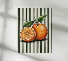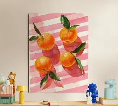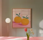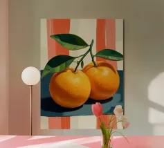 Due mandarini perfettamente rappresentati e strutturati con foglie verdi fresche si appoggiano su uno sfondo di piastrelle rosa tenue, creando una natura morta semplice, bella e moderna.