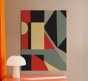 Forme geometriche audaci in rosso, beige, nero e grigio creano una composizione astratta con un uso sorprendente di blocchi di colore e linee. Il gioco di rettangoli, triangoli e cerchi aggiunge profondità e interesse visivo.