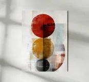 Un'audace opera d'arte astratta con tre grandi cerchi impilati verticalmente in rosso intenso, giallo oro e nero. Gli strati strutturati e i sottili dettagli lineari creano profondità e movimento, mentre lo sfondo neutro aggiunge equilibrio. Questa sorprendente composizione fonde un design moderno con un tocco retrò, rendendola un pezzo accattivante per interni contemporanei, industriali o eclettici.