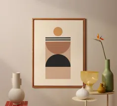 Le forme geometriche sono impilate in una composizione equilibrata. Il disegno è composto da un cerchio e da diversi semicerchi nei toni del nero, del marrone e del marrone scuro.