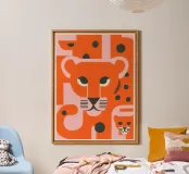Modernità giocosa con un look retrò: questa affascinante composizione riduce i leopardi a forme geometriche di base. Il vivace tricolore - arancione brillante, rosa tenue, grigio intenso - ricorda il design scandinavo degli anni '60 e le illustrazioni naturalistiche di Charley Harper. Le forme bidimensionali e i tratti del viso minimalisti mostrano influenze del Bauhaus e della grafica di metà secolo. Madre e cucciolo appaiono come pezzi di un puzzle astratto, allo stesso tempo carino e sofisticato. Un equilibrio perfetto tra semplificazione ingenua e design perfetto.