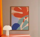 Una composizione astratta ispirata a Maraoui, con forme semplici e ritagliate in colori primari come il rosso, il blu e l'arancione su un morbido sfondo color lavanda. L'opera d'arte è al tempo stesso giocosa e sofisticata.