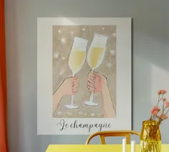 Elegante motivo champagne dal fascino retrò: tre mani che tintinnano su uno sfondo rosa celebrano la vita con bicchieri scintillanti. Questo poster conferisce un'atmosfera festosa a qualsiasi cucina, bar o parete del soggiorno. Perfetto per amiche, buongustai e appassionati di design con un debole per l'eleganza delle bollicine. Stampa artistica di alta qualità per la vostra parete - Salute!