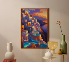 Questo vibrante dipinto a olio celebra la magica ora d'oro a Santorini. Illuminata dalle calde tonalità del tramonto, l'architettura bianca e blu dell'isola risplende di vita mentre scende dalle scogliere verso lo scintillante Mar Egeo. La pennellata dettagliata mette in risalto le texture della pietra, l'acqua scintillante e il delicato gioco di luci e ombre. Il dipinto evoca un senso di serenità e di bellezza senza tempo, rendendolo un omaggio a una delle destinazioni più iconiche e romantiche della Grecia.