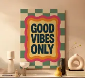 Un poster con citazioni di ispirazione vintage, con toni verdi e arancioni brillanti incorniciati da un bordo retrò ondulato. Progettato per portare positività e colore in qualsiasi spazio moderno.