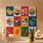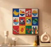 Una griglia colorata con nove diverse ciotole, ognuna contenente un diverso tipo di frutta, dalle banane alle fragole. L'opera d'arte è una celebrazione luminosa, allegra e organizzata di cibi sani e deliziosi.