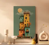 Un'opera d'arte verticale stilizzata che immortala una casa colorata e accatastata sotto la luna piena, decorata con zucche, alberi autunnali e finestre luminose. Un misterioso gatto nero se ne sta tranquillo davanti, aggiungendo un magico tocco di Halloween. Perfetto per gli interni che fondono l'atmosfera stagionale con la narrazione artistica.