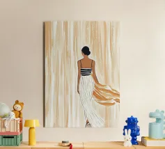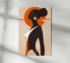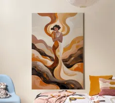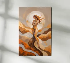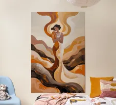 Una donna è raffigurata in morbide onde ondeggianti di tonalità dorate e terrose, che incarnano fluidità e tranquillità. La sua espressione è di dolce contemplazione, mentre si abbraccia in un momento di profonda riflessione. Lo sfondo si integra perfettamente con le sue forme, simboleggiando l'interconnessione tra le emozioni umane e la natura. Le pennellate calde e delicate creano una sinfonia visiva che evoca un senso di benessere e di appartenenza. Questo dipinto celebra la forza e la sensibilità della femminilità, fondendo l'astrazione moderna con una profondità emotiva senza tempo.