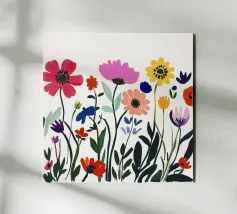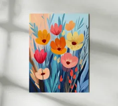 Questa illustrazione floreale dai toni caldi irradia la freschezza della primavera e l'arrivo di giornate più calde. Ispirata ai fiori di campo, offre un'atmosfera allegra e vivace, con toni morbidi di rosso, arancio e giallo, che ricordano il primo risveglio della natura.