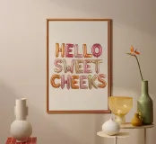 Affascinante tipografia con la scritta "Hello Sweet Cheeks". I tenui colori pastello e le ariose lettere a palloncino creano un look giocoso e affettuoso: un design allegro con leggerezza e umorismo moderni.