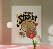 Design urbano del basket con tipografia graffiti, tavolozza arancione e nera e canestro in rete. Uno stile street distintivo per abbigliamento sportivo e casual.