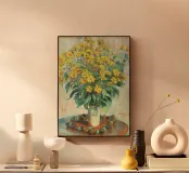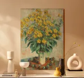 I fiori di carciofo di Claude Monet (1880) è una radiosa natura morta impressionista, ricca di fiori giallo-oro. Dipinta con pennellate energiche e sciolte, la tela cattura la vivacità e il calore della luce solare di fine estate. Monet trasforma l'umile fiore del topinambur in un soggetto elegante e vitale, enfatizzando il movimento, il colore e la bellezza fugace della natura. Questa natura morta floreale anticipa la devozione di tutta la vita di Monet per i giardini e le fioriture, riflettendo la sua capacità di elevare fiori ordinari in opere d'arte senza tempo.