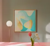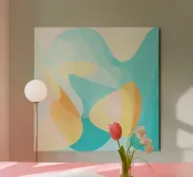 Un morbido motivo geometrico astratto con toni blu pastello e arancione chiaro. Questo design minimalista fonde un equilibrio moderno con una delicata armonia di colori, creando un look rilassante ed elegante. Perfetto per interni contemporanei, salotti accoglienti o spazi che abbracciano il calore e la semplicità.