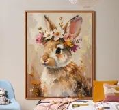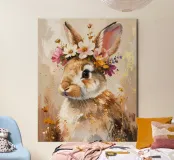 Questo design moderno presenta un simpatico coniglio con fiori sulla testa. Disegnato con delicati acquerelli e accenti dorati, unisce la bellezza naturale all'eleganza artistica. Le morbide sfumature di colore e lo stile astratto conferiscono a qualsiasi ambiente un'atmosfera romantica e giocosa, ma allo stesso tempo elegante: un vero e proprio colpo d'occhio per la vostra casa.