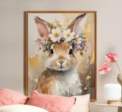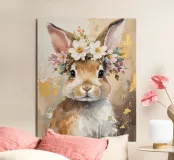 Questo design moderno presenta un simpatico coniglio con fiori sulla testa. Disegnato con delicati acquerelli e accenti dorati, unisce la bellezza naturale all'eleganza artistica. Le morbide sfumature di colore e lo stile astratto conferiscono a qualsiasi ambiente un'atmosfera romantica e giocosa, ma allo stesso tempo elegante: un vero e proprio colpo d'occhio per la vostra casa.