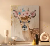 Questo design moderno raffigura un piccolo cervo con fiori sulla testa. Disegnato con delicati acquerelli e accenti dorati, unisce la bellezza naturale all'eleganza artistica. Le morbide sfumature di colore e lo stile astratto conferiscono a qualsiasi ambiente un'atmosfera romantica e giocosa, ma allo stesso tempo elegante: un vero e proprio colpo d'occhio per la vostra casa.