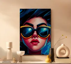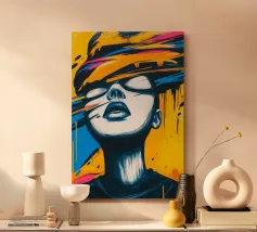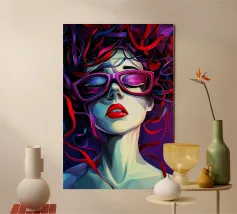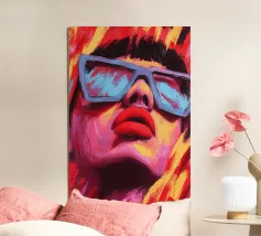 Un volto con occhiali da sole oversize e labbra aperte sembra fondersi nei colori, come se si sciogliesse nel calore. Le linee fluide in viola, rosa e giallo oro conferiscono al quadro un dinamismo surreale, mentre gli occhiali scuri creano una distanza misteriosa. In equilibrio tra freddezza e dissoluzione, questa rappresentazione cattura la natura fugace dell'identità e della percezione - un simbolo di transitorietà e di fusione con l'ambiente circostante.