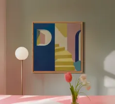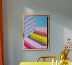 Pittura acrilica di scale a strisce rosa e gialle contro un cielo blu brillante. Composizione minimalista e geometrica con linee pulite, luce soffusa e una tavolozza di colori estivi di ispirazione rétro. Design moderno, accattivante ed equilibrato.