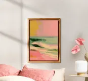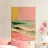 Quadro astratto di una scena di spiaggia nei toni del rosa, del verde e del giallo. Giallo e rosa in alto, striscia verde-blu con onda bianca al centro. In basso, rosa con accenti arancioni e bianco con sfumature giallo-verdi. Le pennellate visibili e le delicate transizioni di colore creano profondità e movimento.