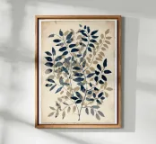 Foglie stratificate color indaco e tortora si sovrappongono in lavaggi traslucidi, formando un'elegante silhouette botanica. I bordi invecchiati della carta e la moderazione tonale evocano la tranquilla bellezza delle impressioni cianotipiche e dei primi studi naturalistici.