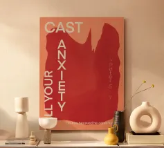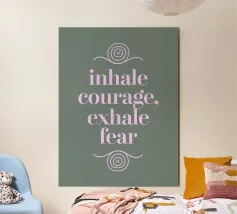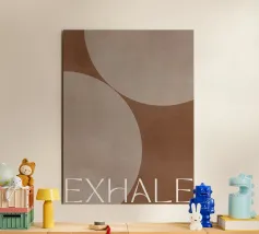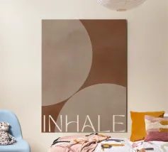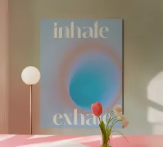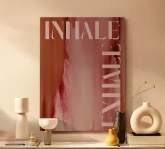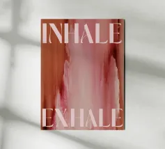 Un design minimalista che traduce la respirazione e la consapevolezza in forme e colori. Superfici delicatamente sovrapposte in verde tenue, rosa e nero formano uno sfondo calmo e organico. Le parole INHALE (orizzontale in alto a sinistra) ed EXHALE (verticale a destra) sono scritte in lettere maiuscole bianche e chiare: ridotte ma efficaci.