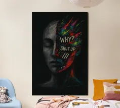 Metà del volto è monocromatico e scuro come la fuliggine, l'altra metà esplode in schizzi neon di fucsia, lime e ciano. In alto, le parole "WHY? shut up" (perché?) sono scarabocchiate come un pensiero frammentato, unendo l'emozione viscerale alla grafica di ispirazione punk. Linee frastagliate, punti e segni simili a glitch si disperdono nella composizione, imitando l'irrequieto chiacchiericcio mentale. Stampato su carta opaca da galleria con pigmenti d'archivio, questo pezzo tagliente si adatta a qualsiasi spazio - studi, dormitori o centri creativi - e invita a riflettere sul rumore interno e sulle parole che lasciamo in sospeso.