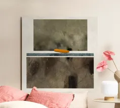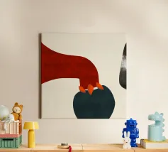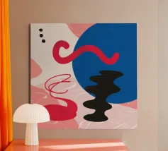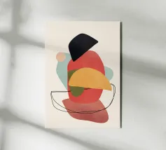 Vivace opera d'arte astratta minimalista. Il contrasto tra il rosso acceso e il verde scuro crea un'intrigante dinamica visiva. L'aggiunta delle tre forme arancioni luminose vicino al centro aggiunge un punto focale e migliora la composizione complessiva. Questa opera d'arte minimalista combina semplicità e complessità.